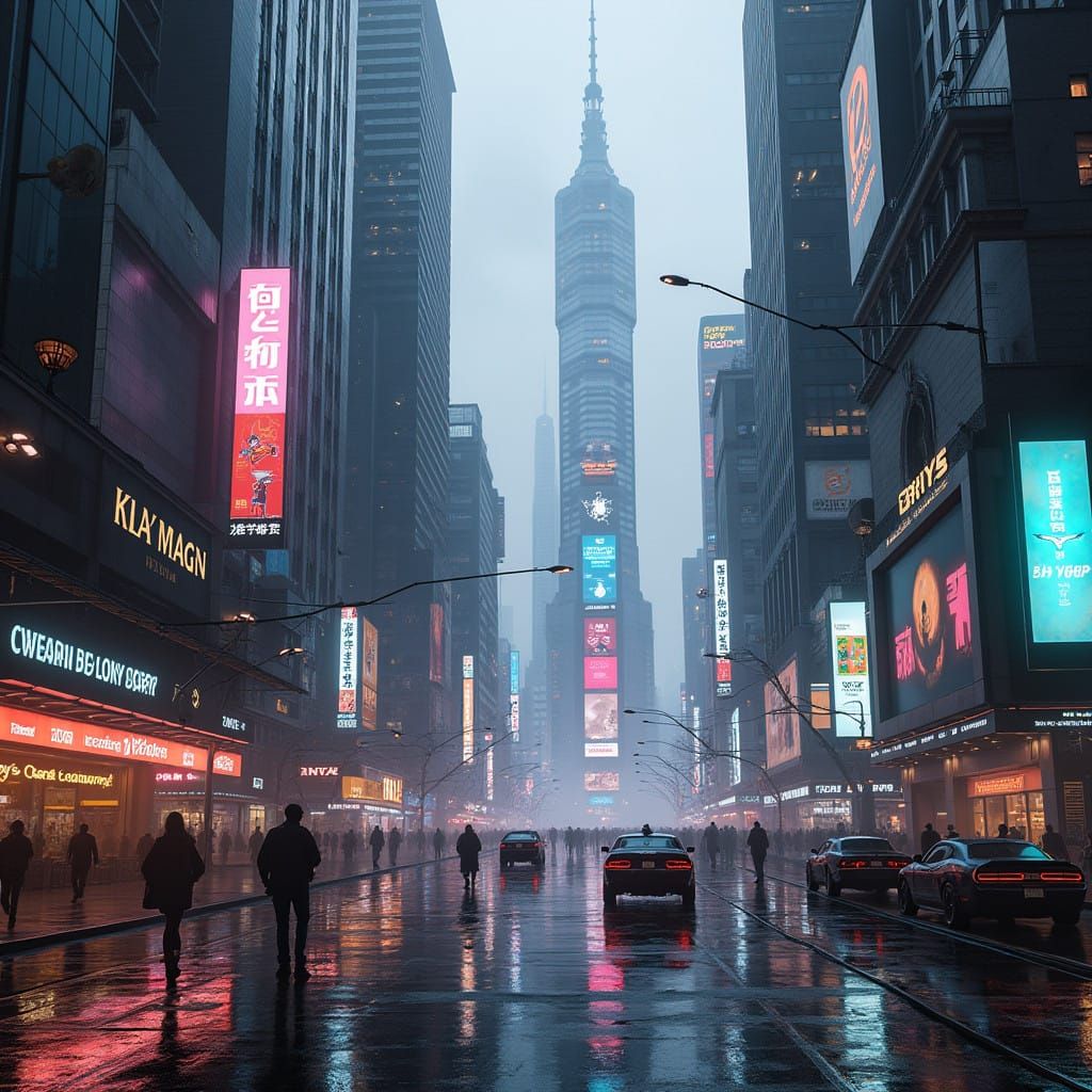 This image depicts a futuristic cityscape in 2028, showcasing sleek skyscrapers, neon lights, and holographic advertisements amidst a bustling metropolis, blending cyberpunk and dystopian elements with advanced technology and metallic surfaces.
