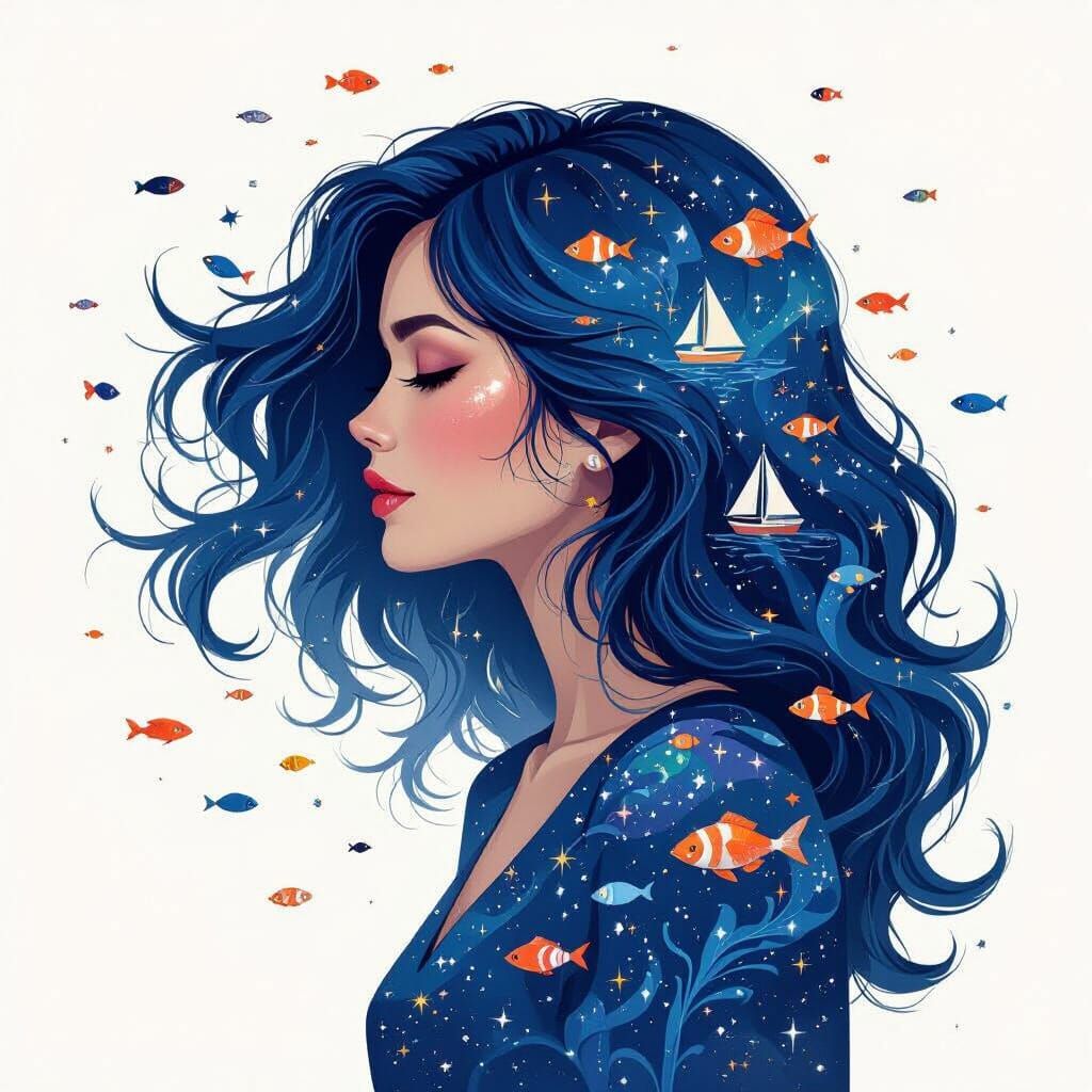 This image shows a woman's profile with flowing hair containing sea life, rendered in blue and purple tones. The artwork has a detailed digital illustration style.
