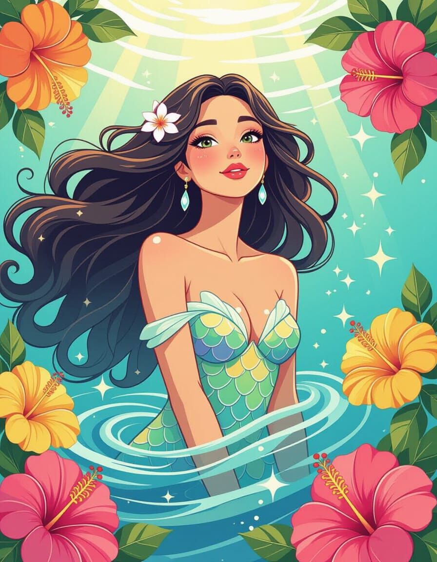 A vibrant 2D cartoon of a woman emerging from the ocean. The illustration features rainbow hibiscus and seaweed hair with bold outlines, flat colors and a soft, warm glow in an art nouveau style.