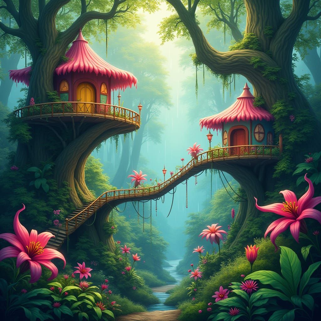 This enchanting image depicts a vibrant fantasy rainforest kingdom, with intricately designed RainWing huts nestled high in the treetops, connected by twisted vine bridges, amidst lush jungle foliage and radiant tropical plants, evoking a peaceful and magical atmosphere.
