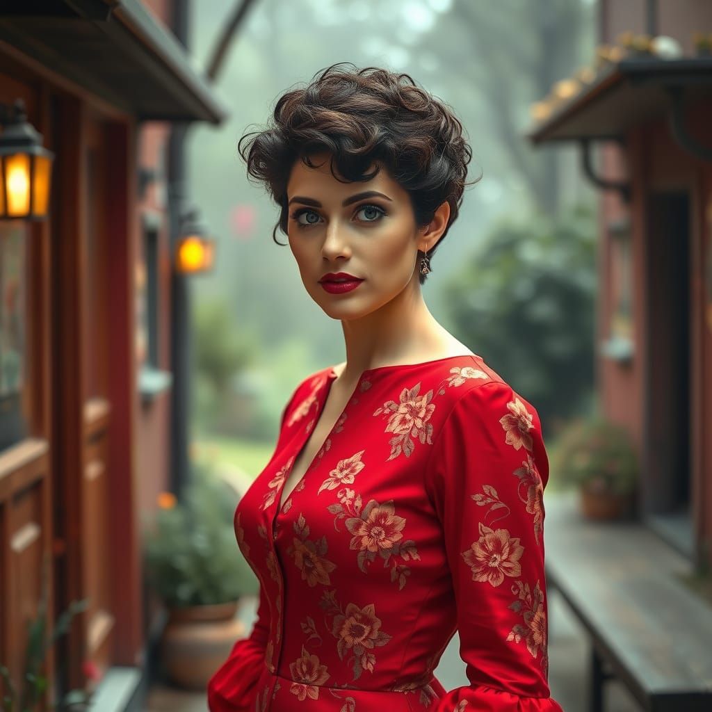 A portrait of a woman with dark curly hair wearing a red vintage dress. The image evokes an Art Nouveau style with vibrant colors and delicate, detailed linework.