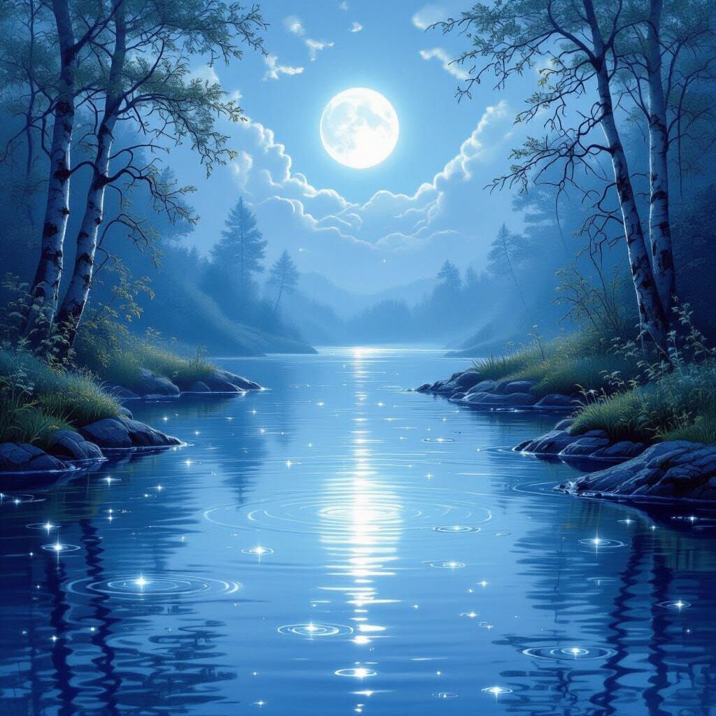 This image features a calm, reflective river under ethereal, soft lighting. Glowing accents and subtle ripples create a tranquil, lunar-inspired scene with blues, silvers, and indigos.
