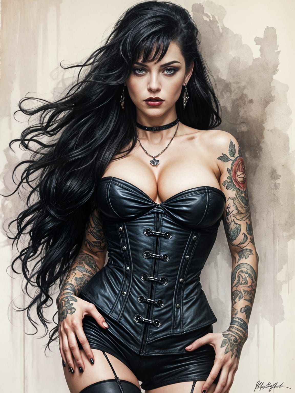 A striking picture of a 1990s goth woman with tattoos, in a leather corset and ripped stockings. This mixed media pin-up art evokes the glamour and style of vintage oil paintings and watercolors.
