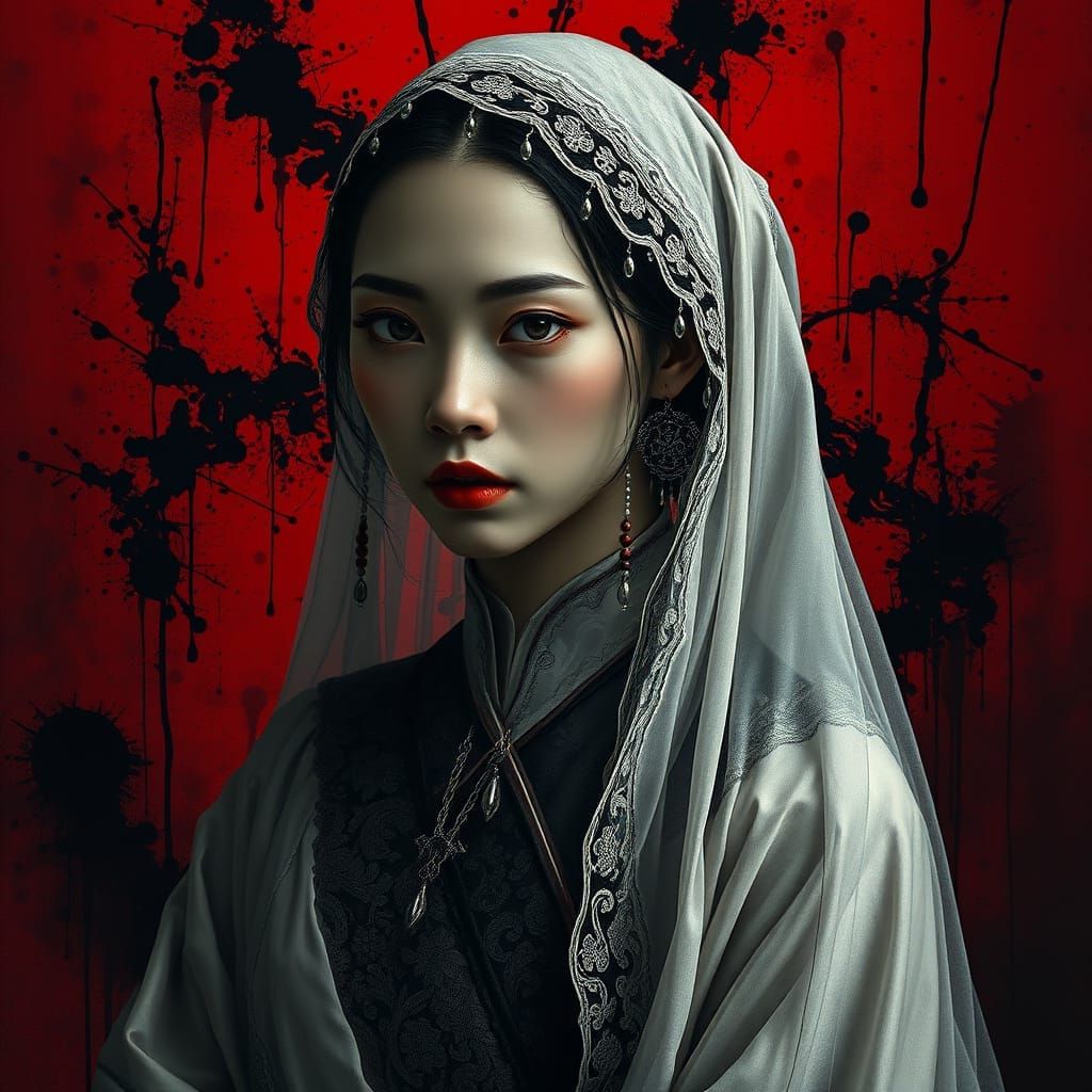 A portrait of a mysterious woman with an ethereal beauty, shrouded in a delicate veil and traditional attire, set against a bold and dramatic backdrop of reds and blacks, blending realism and surrealism with gothic and fantasy elements.