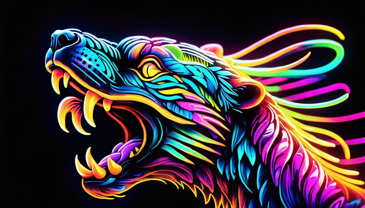 This image shows a close-up of an animalistic neon tattoo on an arm, rendered in a digital painting style. The tattoo features glowing neon lines and vibrant colorful ink against a dark gradient background, in an abstract expressionist style.