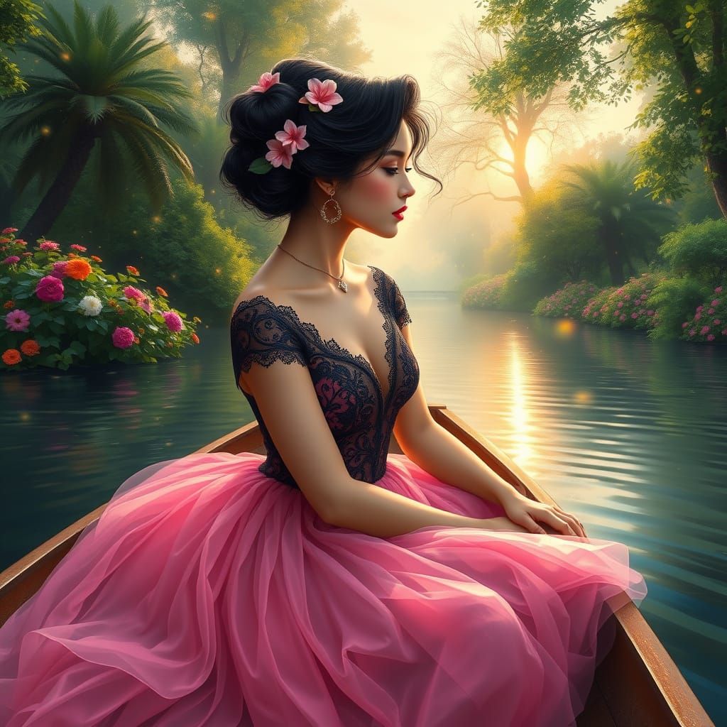 A whimsical realistic airbrushed oil painting of a stunning young woman sitting in a boat going down the river. She is dressed in a filmy hot pinky, black elegant lace dress, black colored hair in an updo and adorned with flowers, perfect anatomy. The late afternoon sun reflects off the river. Slight profile view. Fireflies fluttering in the air. Green follage, trees and flowers on both banks of the river. The scene is mystical, magical and full of sparkle.
