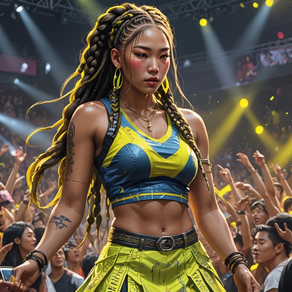 This image shows a portrait of a tall, curvy Korean woman with cornrows. She's wearing a neon yellow mini skirt at a concert, rendered with dynamic lighting and intricate detail in a splash art style.