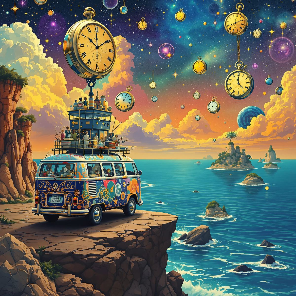 This image shows a vintage Volkswagen bus as a surreal mobile art studio on a cliff, inspired by Salvador Dalí and Moebius. Features floating islands and pocket watches in a vibrant, dreamlike scene.