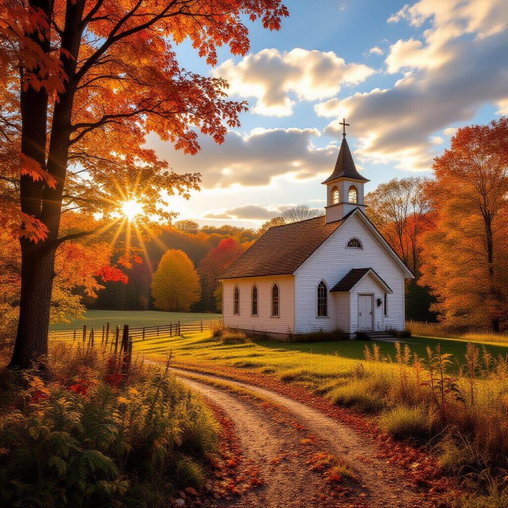 Easily generate photorealistic images of country churches on autumn days. Try our free AI image generator now!