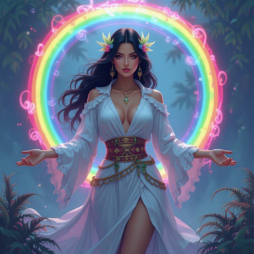 A vibrant, swirling cannabis leaf art piece. The image features glowing tendrils and psychedelic patterns in a dreamlike style, reminiscent of digital art.