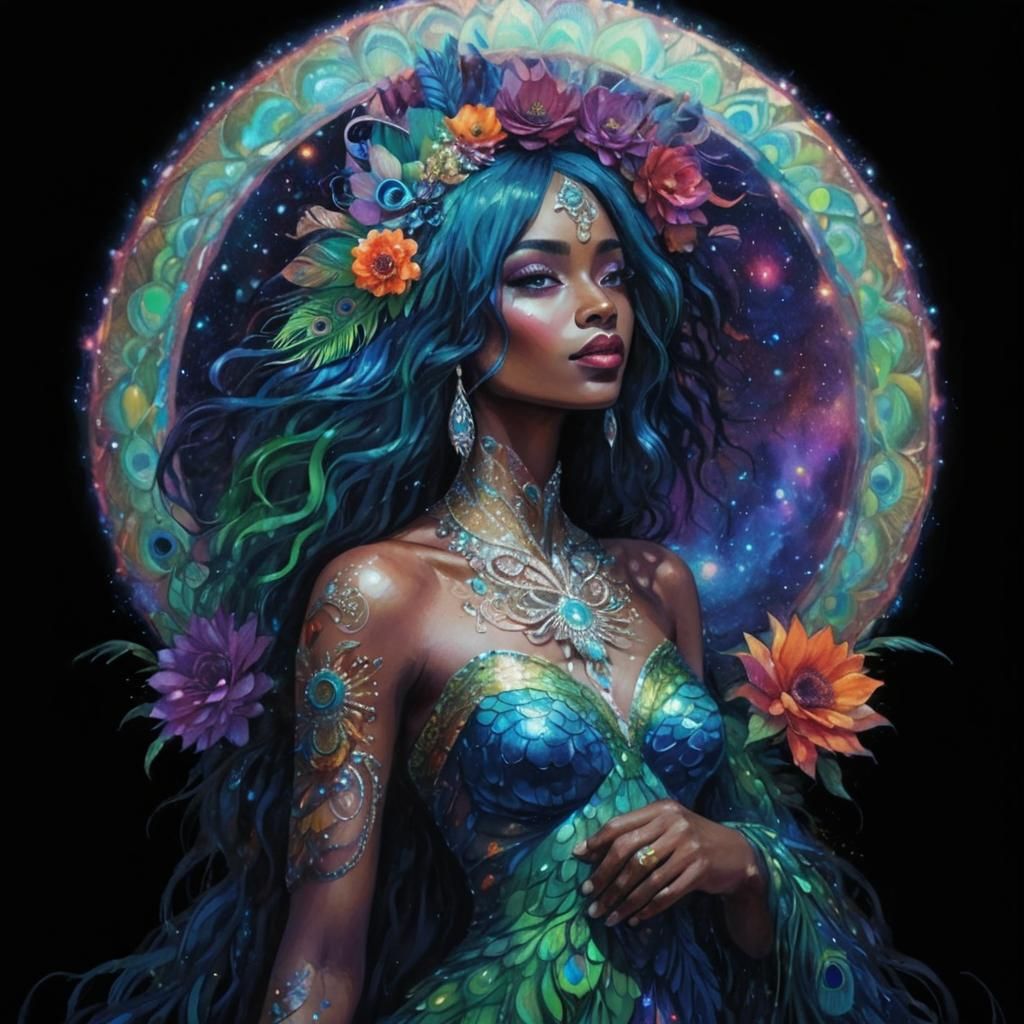 A striking picture of a beautiful dark-skinned woman with peacock feathers in her hair and an orange flower crown. This digital art piece features iridescent rainbow colors and a cosmic background.