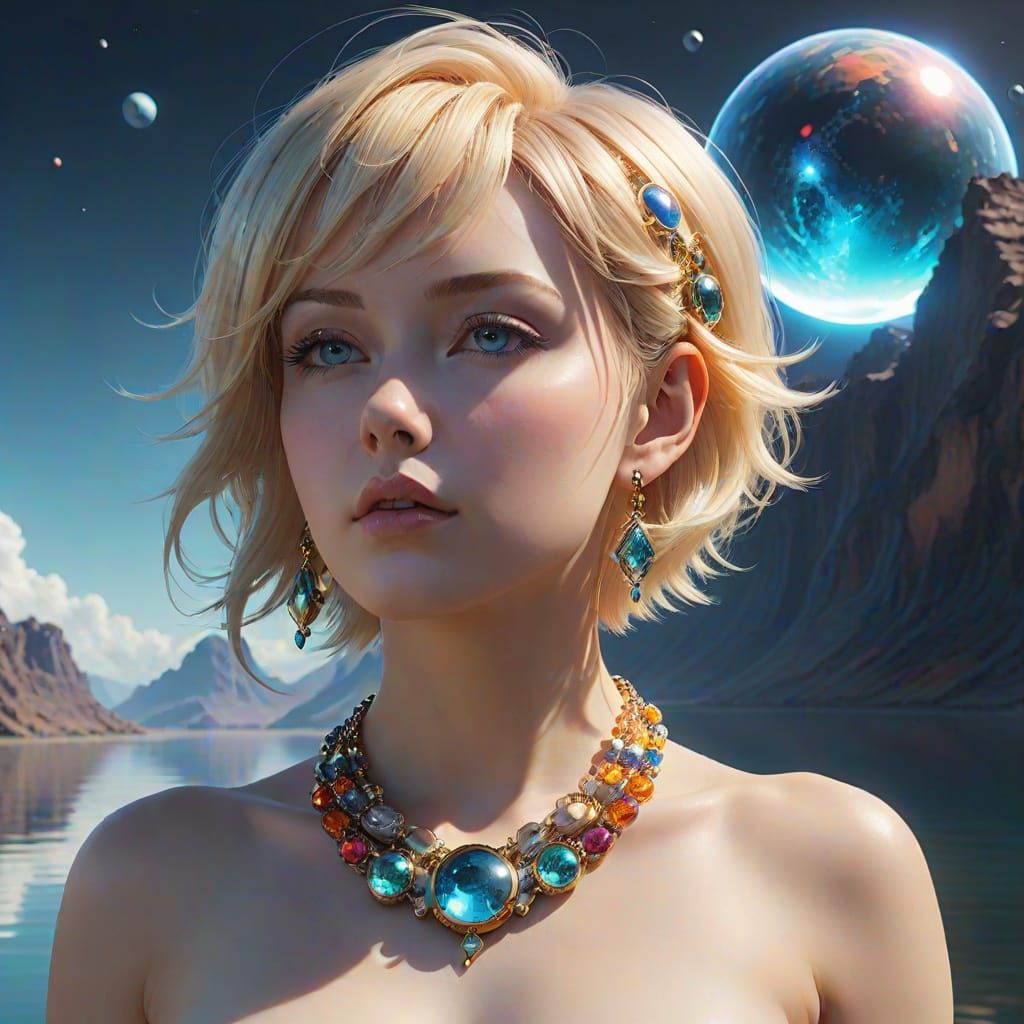 A double exposure portrait of a woman with robotic implants, set against a colorful alien landscape with large moons. The image has a detailed, aesthetic quality reminiscent of 3D anime art.