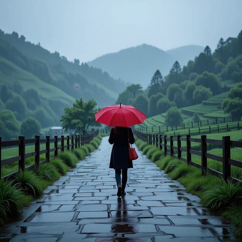 This image shows a person with a bright red umbrella on a wet stone path surrounded by green hills. The scene has a peaceful, reflective atmosphere with soft, overcast lighting and muted natural colors.