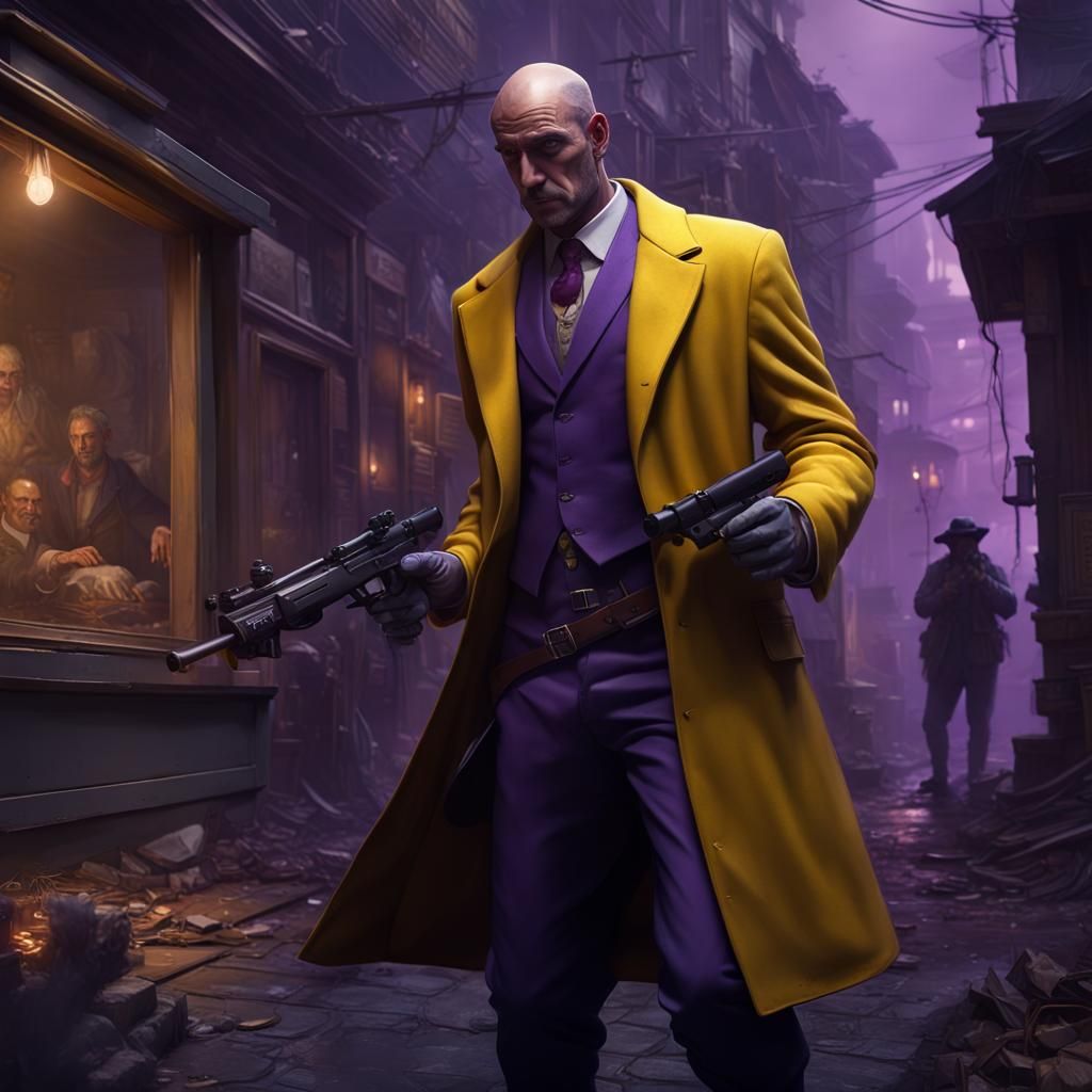 A hyperdetailed digital artwork depicting a spy assassinating a man outside a clinic. The masterpiece features dynamic and volumetric lighting with purple and yellow complementary colors.