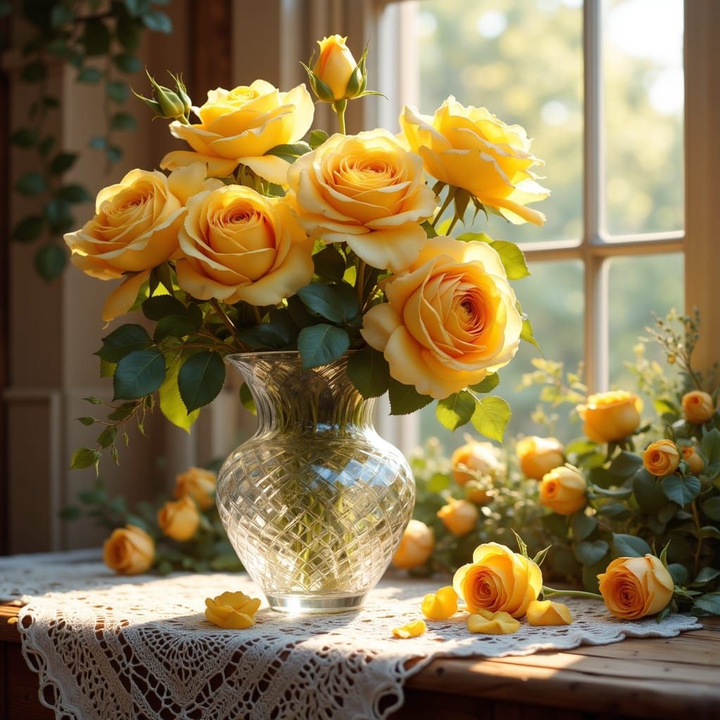 A beautiful still life of four large, yellow roses in a delicate Bohemian crystal vase on a rustic birch table, surrounded by intricate lace and warm sunlight, rendered in a photorealistic style with attention to color and composition.