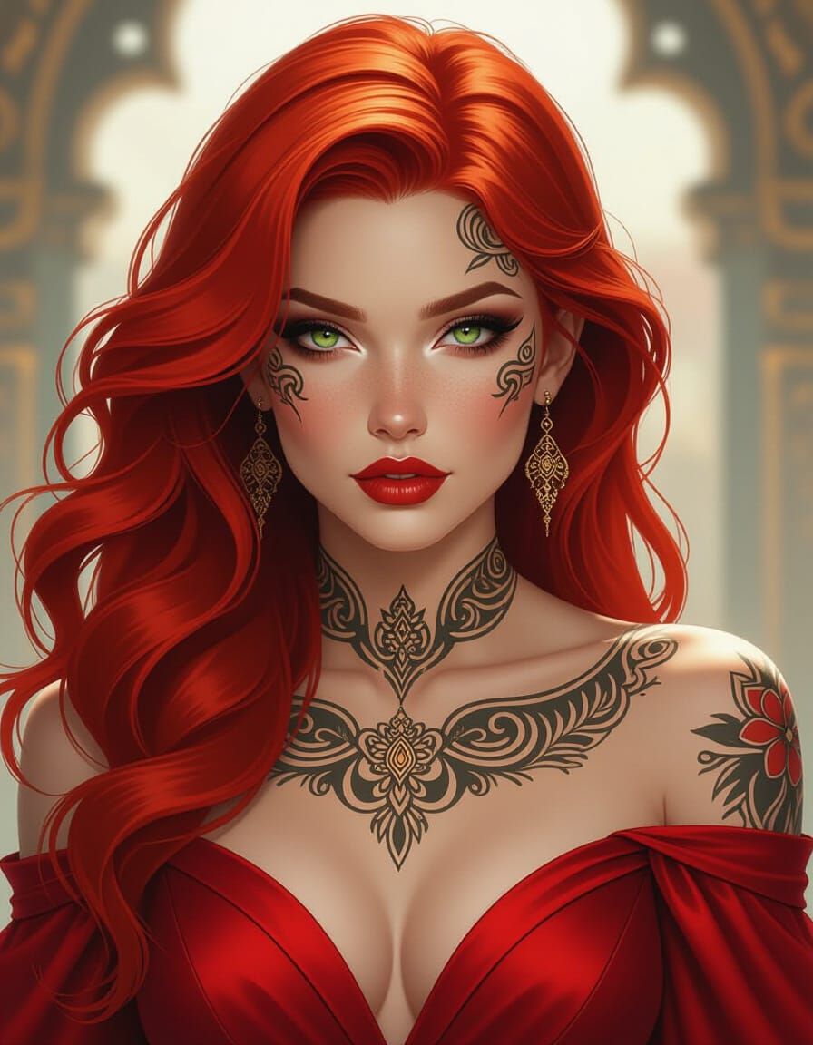A striking portrait of a woman with red hair and green eyes, featuring tribal tattoos. She is wearing a red silk gown, rendered with soft lighting and a shallow depth of field, in a modern fantasy art style.