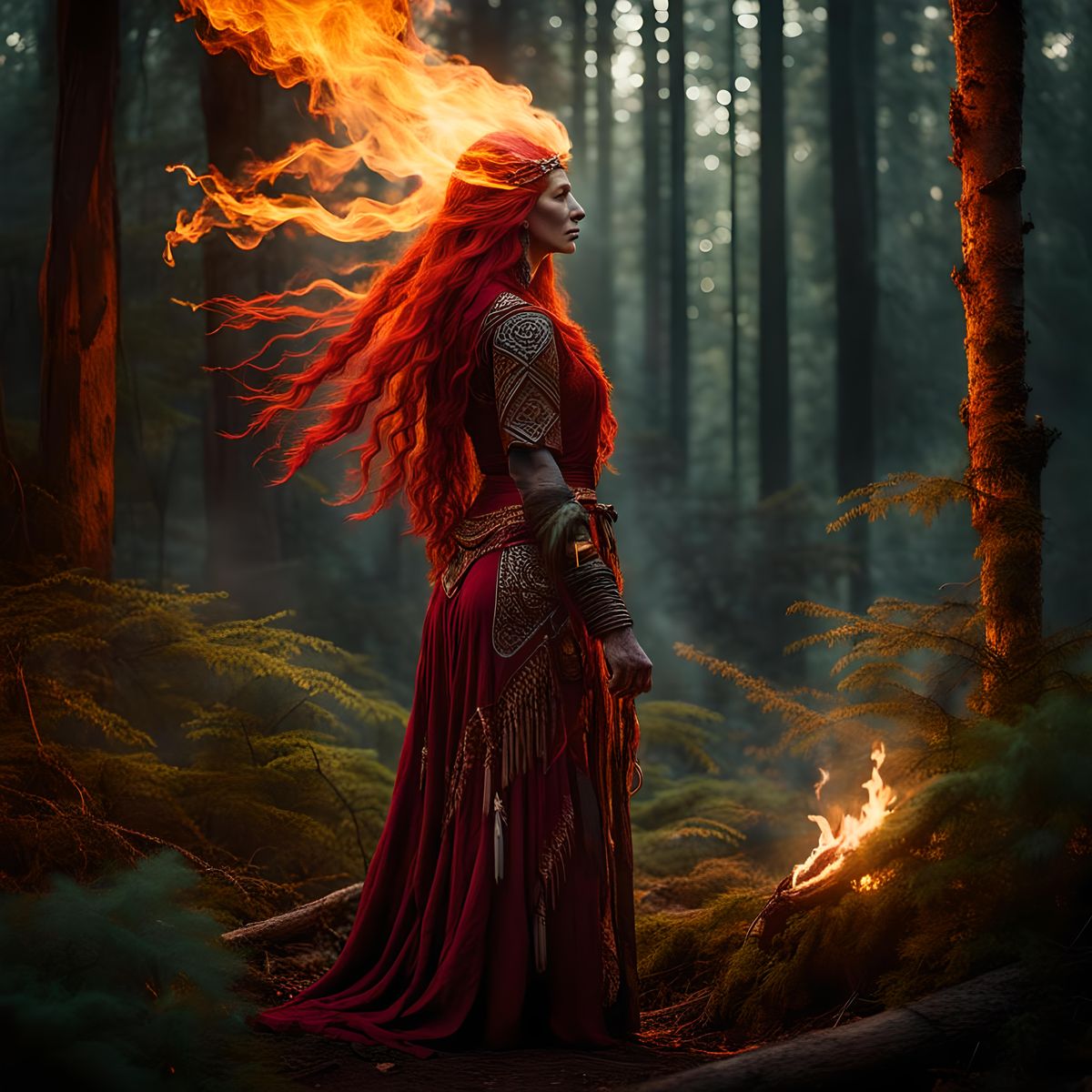 This image shows a red-haired woman in shamanic dress standing in a forest. The scene is illuminated by firelight, creating a mysterious and cinematic atmosphere with high detail and contrast.