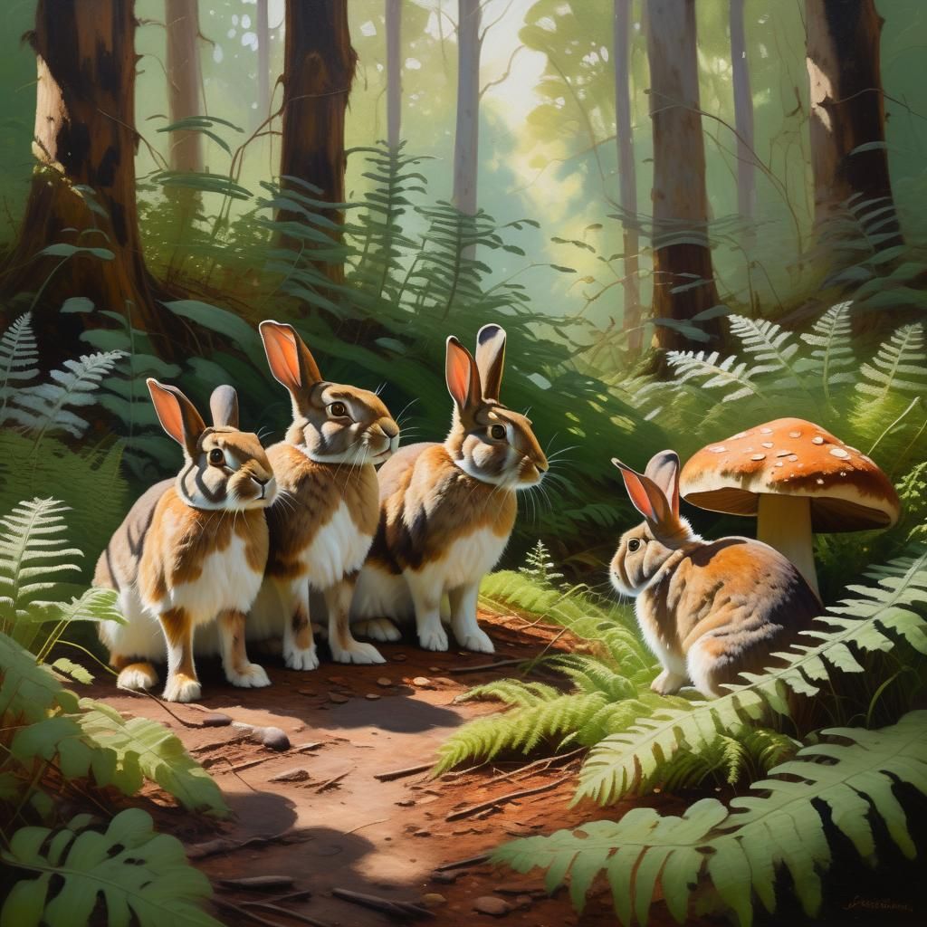A medium shot oil painting shows three rabbits amidst mushrooms and ferns on a forest floor. Warm light filters through trees, creating dappled shadows and a cozy atmosphere, in an impressionistic style.