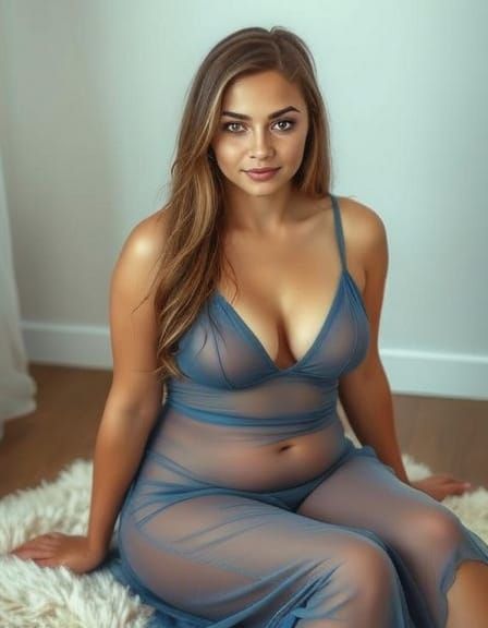 This image shows a plus-size Australian woman in a sheer blue dress, sitting on a rug. The artwork features warm lighting, vivid colors, and realistic textures in a digital painting style.