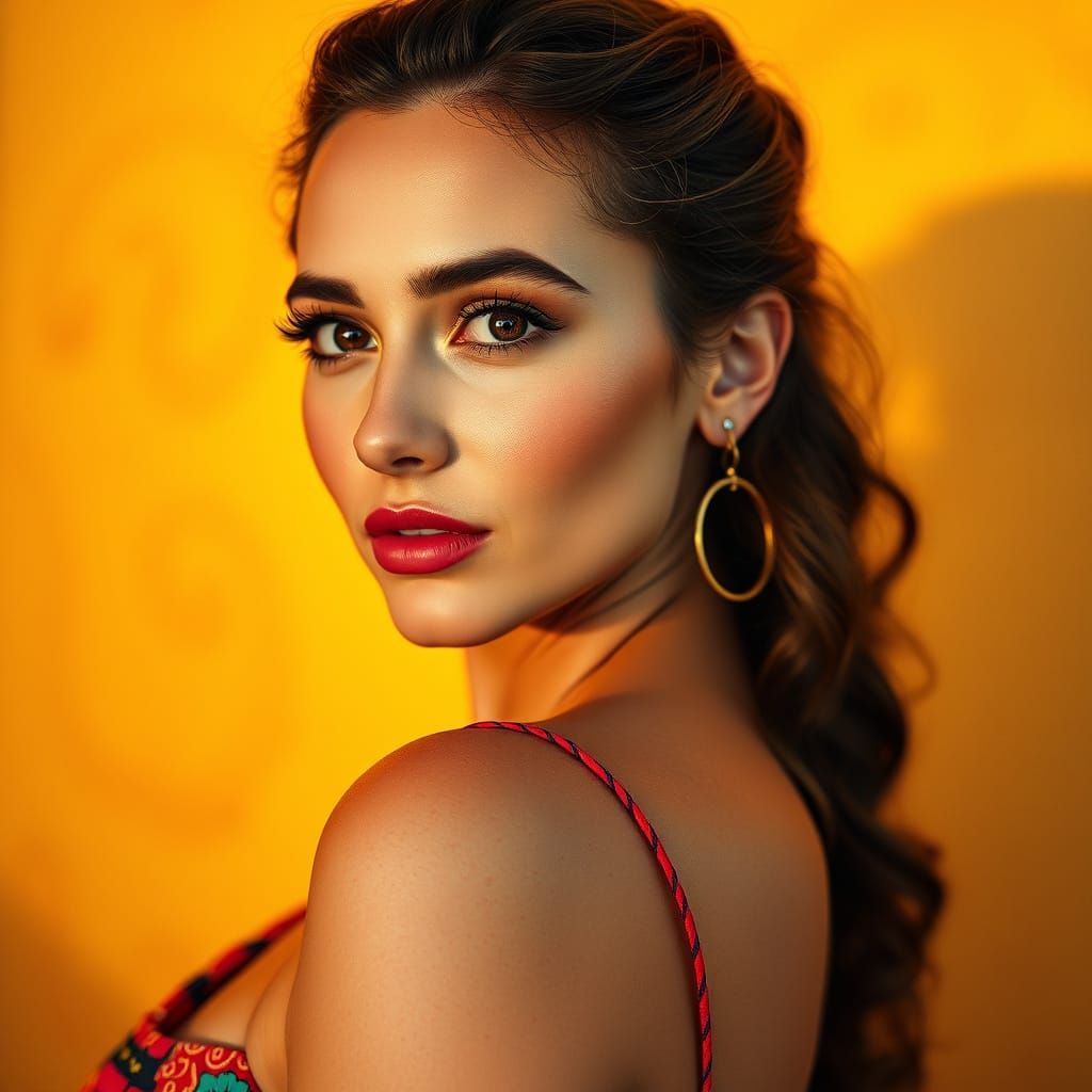 A captivating portrait of a curvy woman wearing a vibrant summer dress, set against a warm, sun-kissed backdrop. The image features a natural, golden glow and subtle freckles, reminiscent of a classic Renaissance painting.