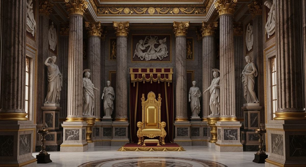 This image shows a lavish throne room in an ancient Roman palace, filled with gold ornaments and marble statues. Soft natural lighting and crisp focus enhance the luxurious details in this exquisitely detailed photograph.