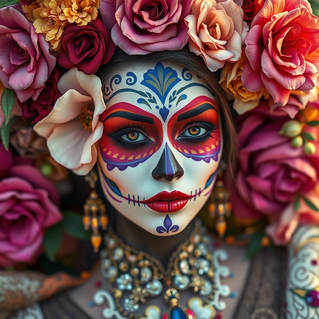 This image features a beautiful woman surrounded by lush flowers, wearing intricate face paint in vibrant Día de los Muertos colours, with ornate clothing and delicate textures, in a romantic and whimsical style reminiscent of Art Nouveau.