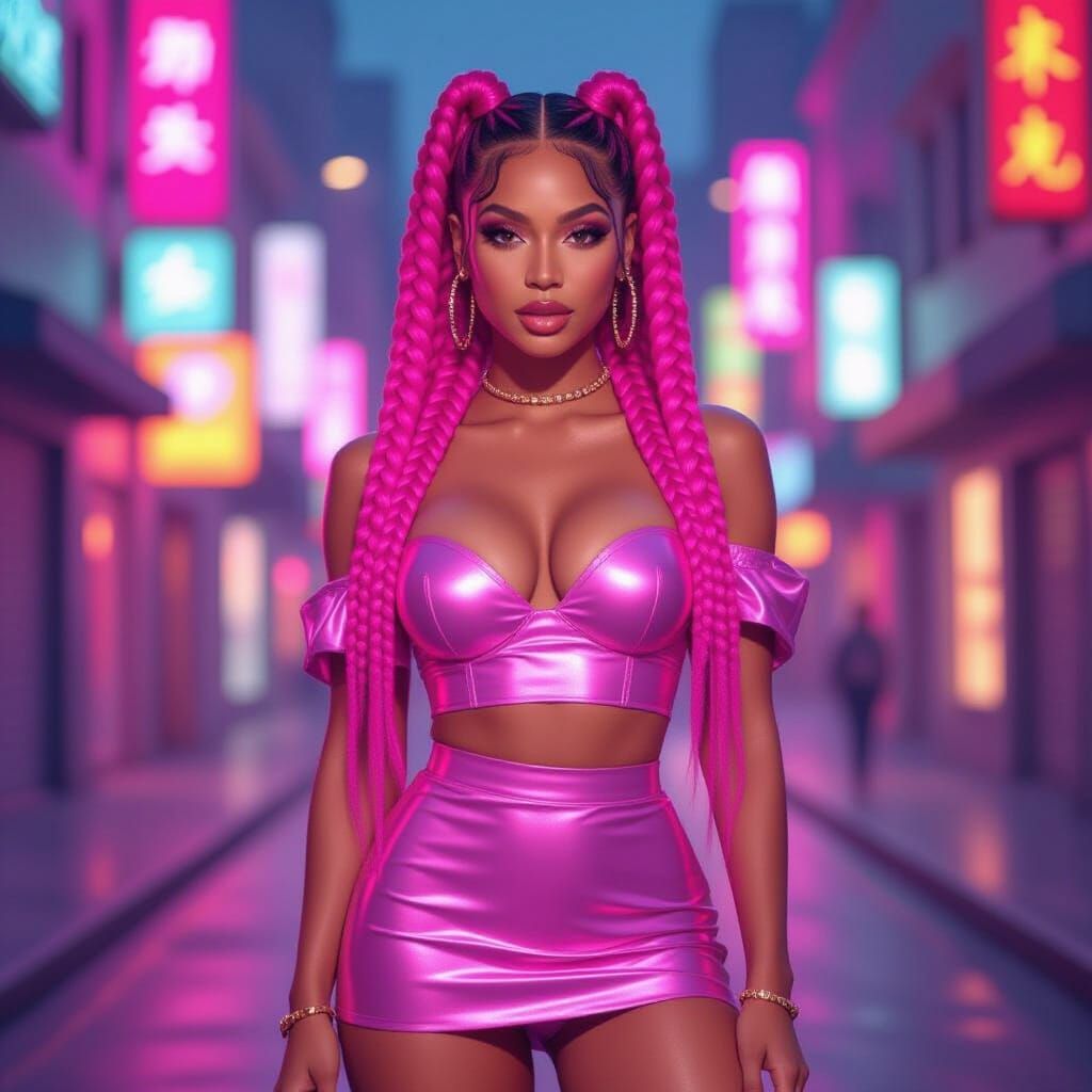 A radiant Black woman with luminous skin and pink ombre braids, wearing a metallic pink corset. Set against a pastel neon street, this concept art captures influencer streetwear vibes with vibrant lighting.