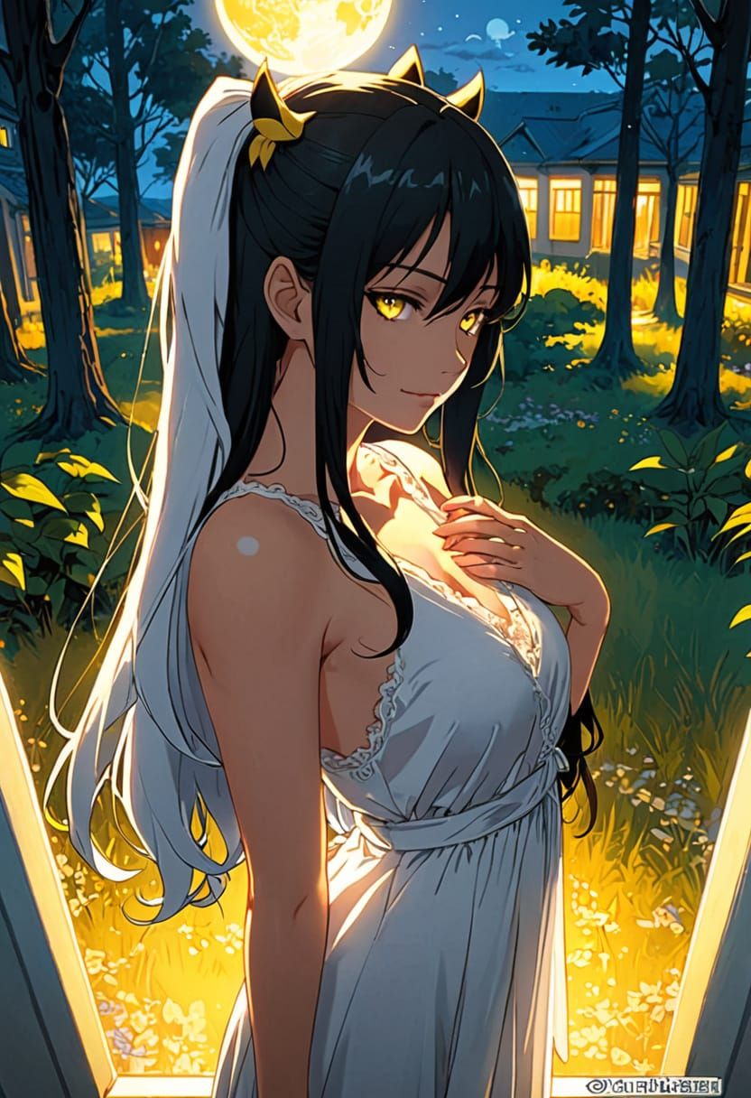 This image shows a slender woman with long black hair and striking yellow eyes, standing in a dimly lit bedroom. She's wearing a white nightgown, rendered in an anime style.