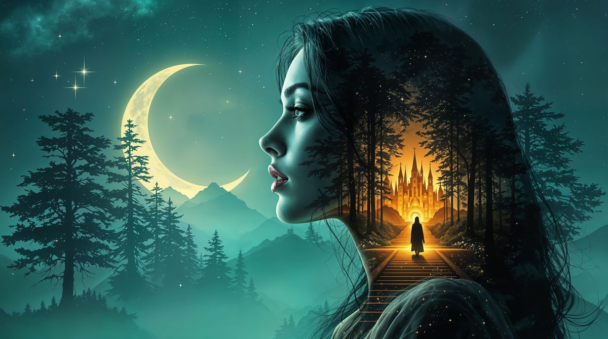 A dreamlike double exposure image featuring a contemplative woman in a mystical forest, with a portal to a golden city and a sentinel figure under a celestial sky, blending deep blues and golden hues.