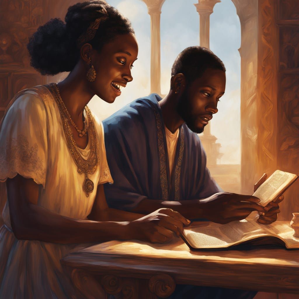 This image shows a young woman facing a mirror reflecting herself and a dark-skinned man reading together. The vibrant oil painting style features soft golden light, warm colors, and deep shadows.