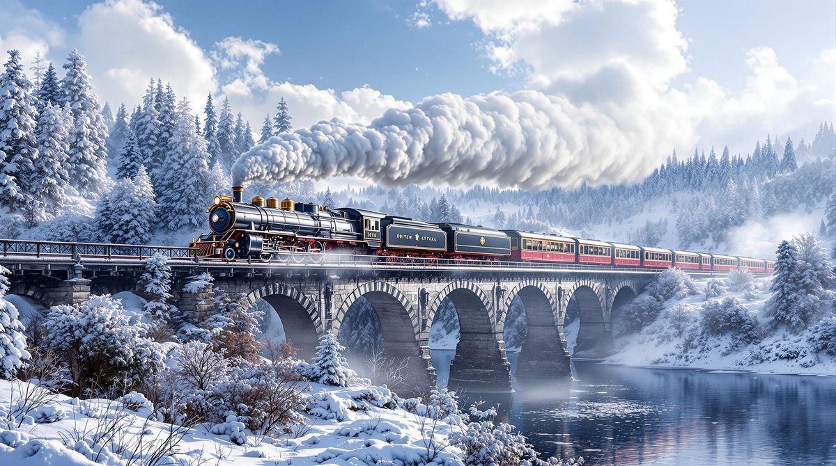 A striking image of a steam train crossing an arch bridge over a serene winter landscape, showcasing its intricate details and grandeur.