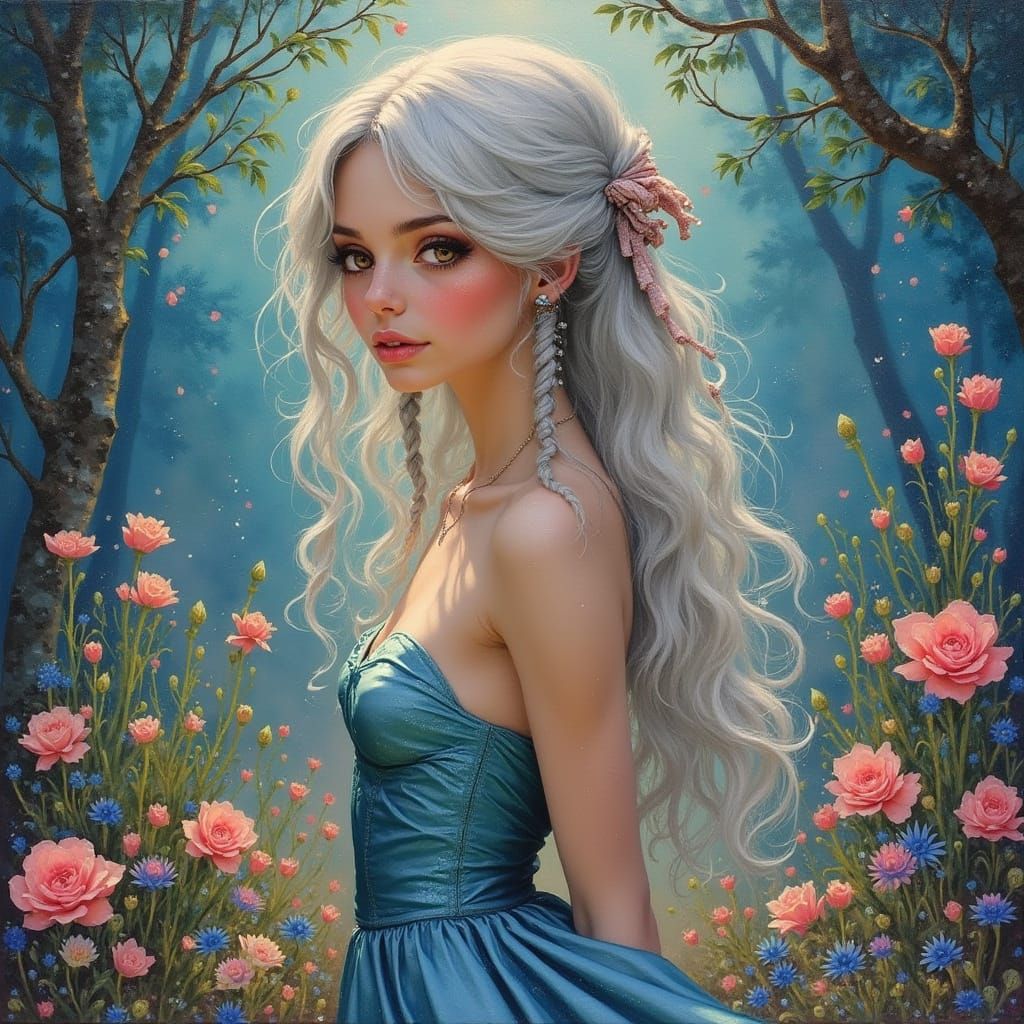 A striking picture of a silver-haired woman in a stardust gown, standing in an otherworldly garden. The image is rendered with thick impasto oil strokes, impressionistic techniques, and a mix of futuristic and mystical elements.