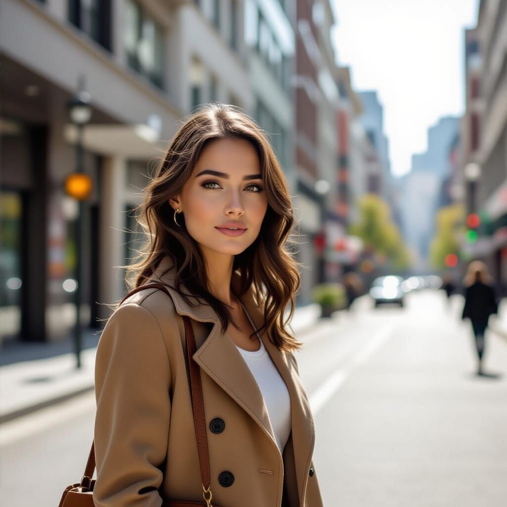 This image captures a woman standing in a modern urban street, rendered in a hyperrealistic photographic style with incredible detail and sharp focus.