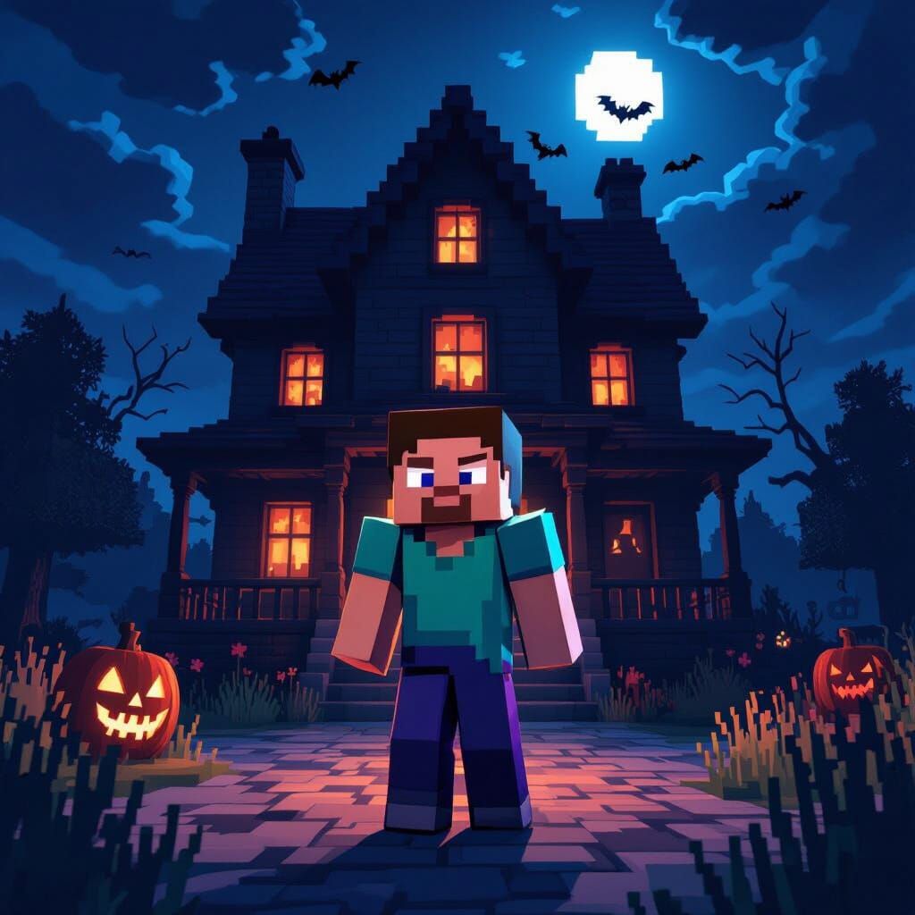 This image shows a Minecraft character before a haunted house at night. The scene features pixelated textures and eerie lighting, with a digital painting aesthetic and vibrant colors.