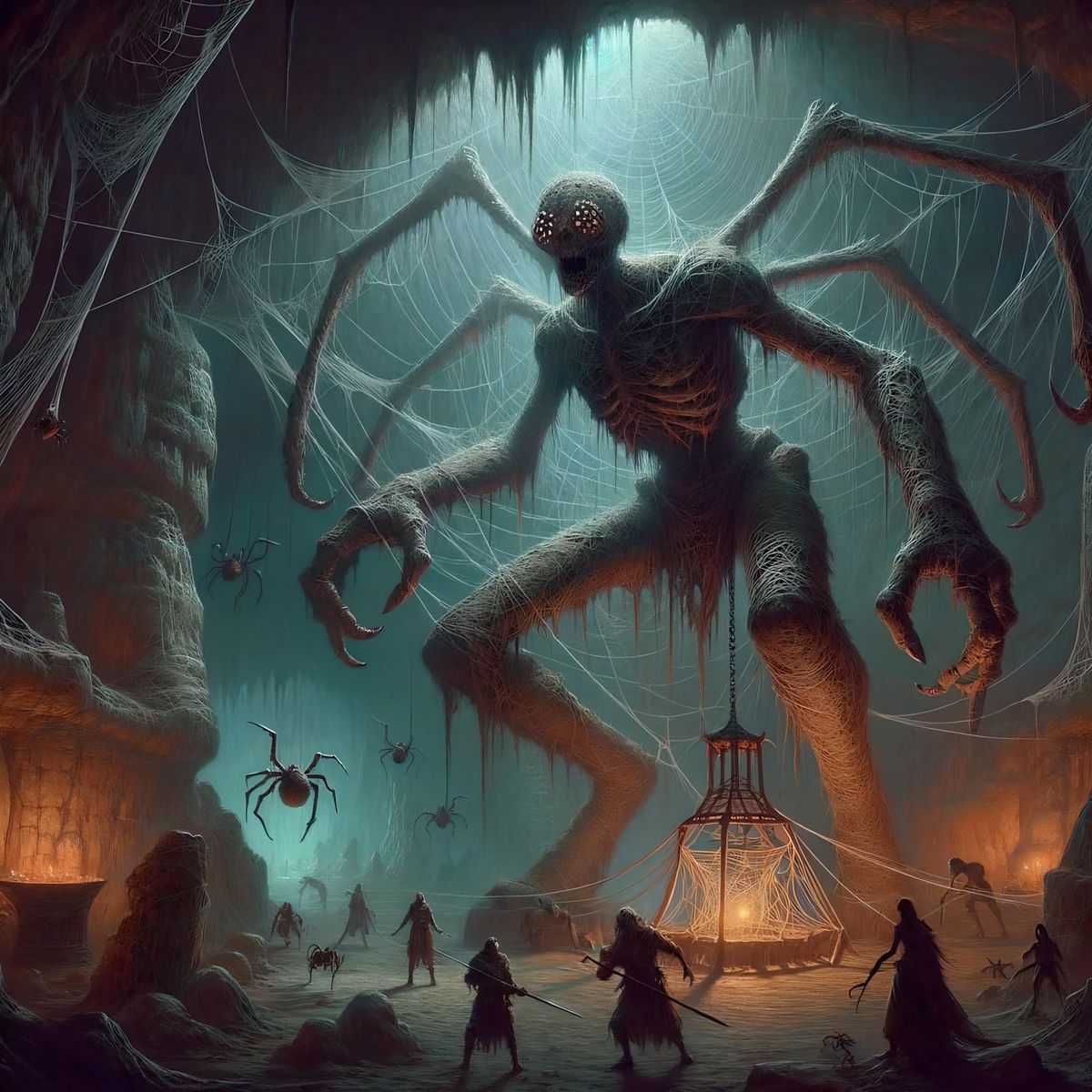 A depiction of a towering Web Golem ambushing adventurers in its cavernous lair. The golem, made of dense spiderwebs, lunges from the ceiling, its many eyes gleaming in the dim light of the spider-infested cave.