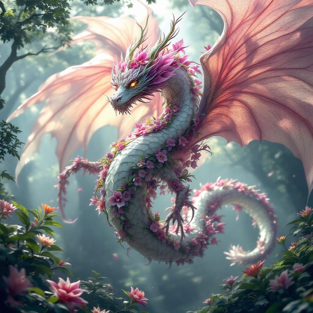 This stunning image captures a living botanical marvel mid-flight, with delicate petals and iridescent networks of green and magenta on its massive wings. The dragon's body is a flowing composition of stems, flowers, and vines, with soft rose petals and crystalline structures. Bioluminescent blooms pulse...