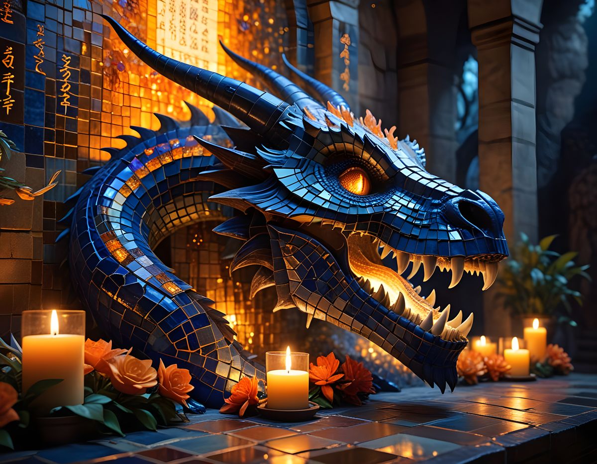 An incredibly gorgeous ultra closeup of a huge dragon's skull made entirely of large, crystal clear, transparent see-thru glass tiles in a mosaic, some pieces missing, with candles glowing inside the skull illuminating the eyes, the mouth, the long sharp teeth, the candle light throwing sinister skull ...