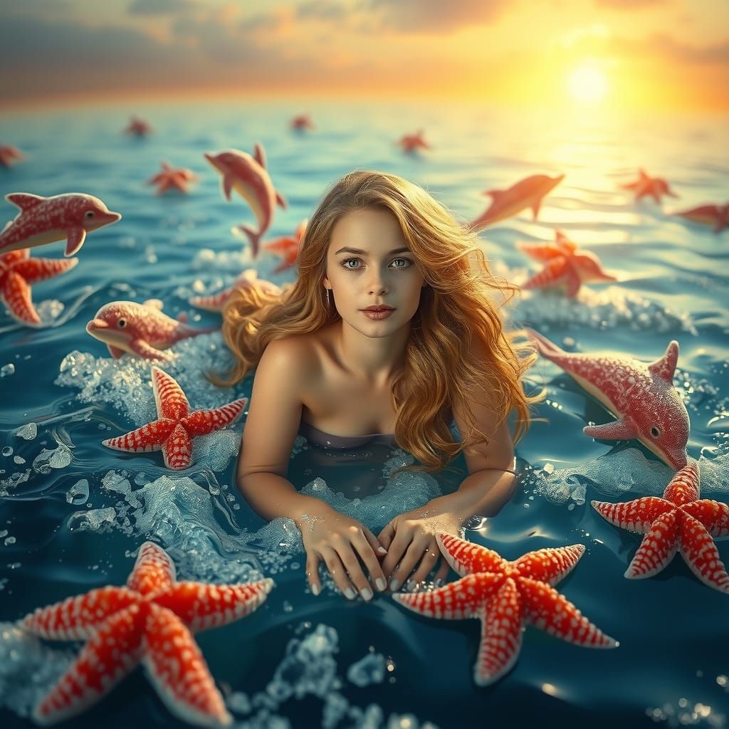 This image shows a golden-haired woman floating on a soda sea, encircled by gummy dolphins and sugar starfish. The artwork features vibrant colors and delicate textures in a surreal, cinematic style.