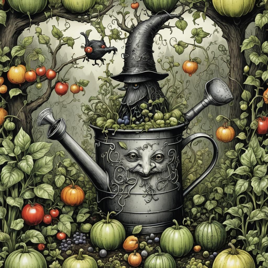 This image shows anthropomorphic fruits and vegetables with faces growing in a witch's garden. A watering can acts as the witch's familiar, illustrated with intricate knotwork and vibrant colors.