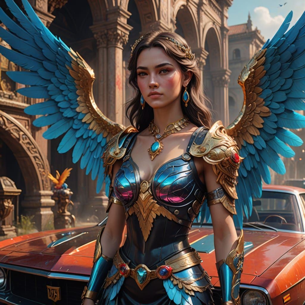 This image showcases a stunning female angel posing in a lush, vibrant environment surrounded by brightly colored muscle cars. The angel's ornate wings and jewelry are meticulously detailed, while the cars shine with glossy, reflective surfaces. The scene is bathed in warm, soft light, with a subtle mist...