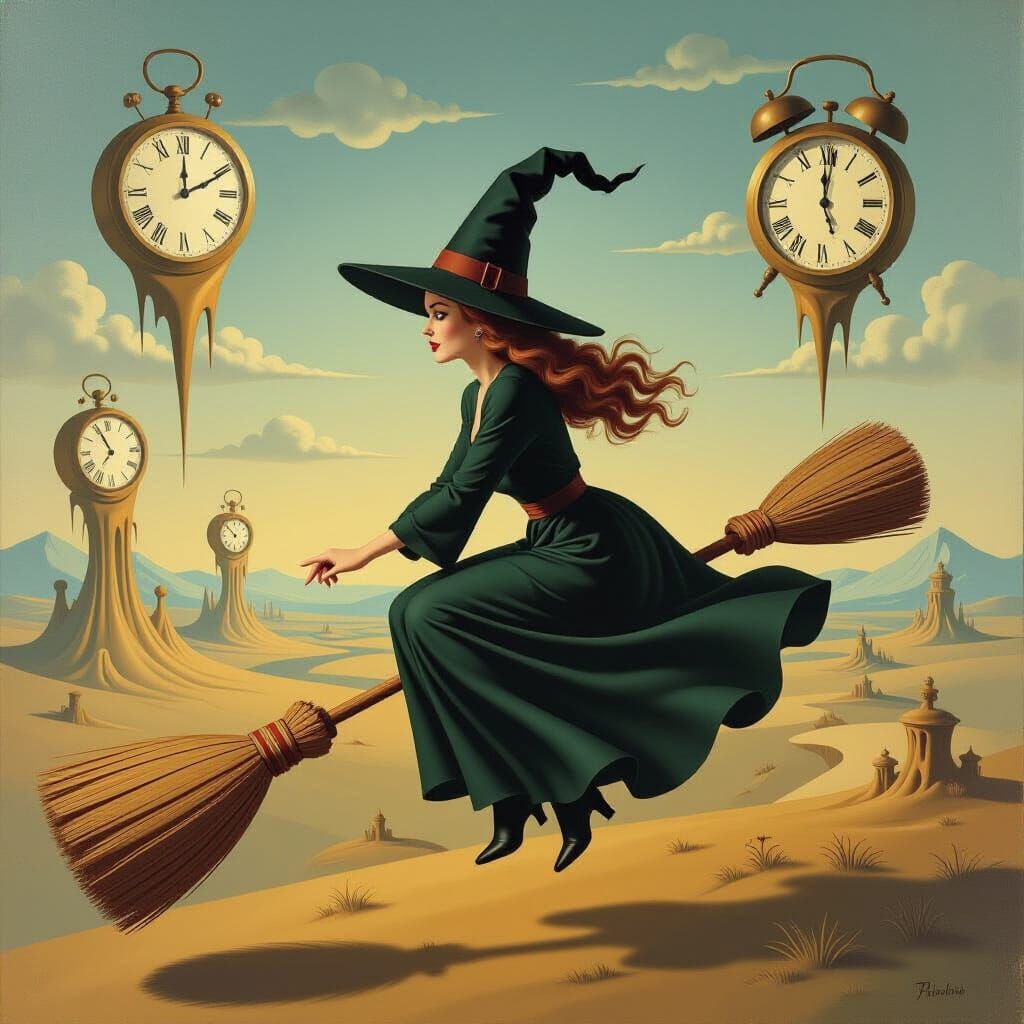 This image shows a 1940s witch on a broomstick flying over a surreal landscape with melting clocks. Rendered in an oil on canvas style with a matte finish and muted colors.