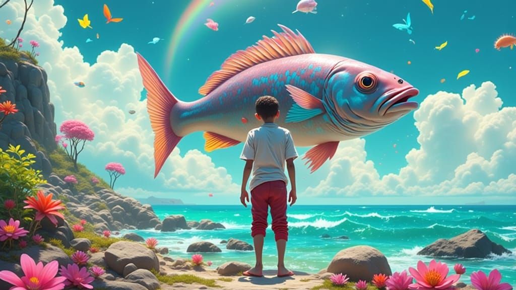 This image shows a boy in tattered clothing standing on a Madagascar rocky shore in 1994. The photograph captures a surreal, dreamlike quality with vibrant colors and 3D elements.