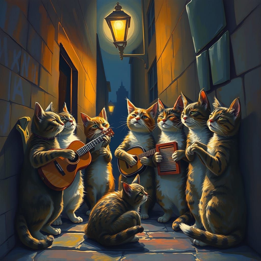 This image shows a vibrant oil painting of alley cats gathered in a moonlit alleyway, singing and playing music. The scene features dynamic lighting and bold brushstrokes for a magical atmosphere.