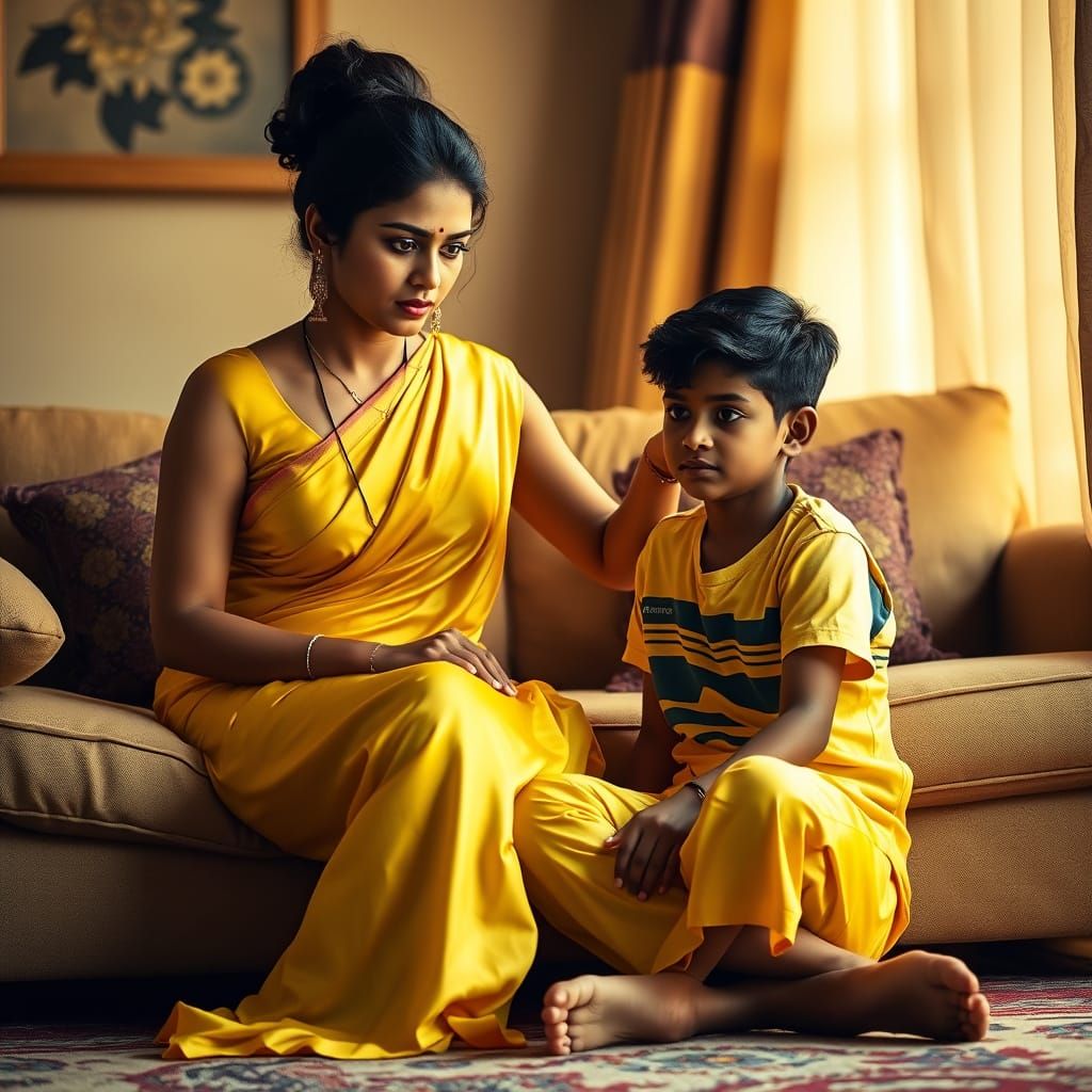This image shows a beautiful Indian woman in a yellow silk outfit sitting on a sofa, seriously admonishing a young man. Features cinematic lighting and rich textures.