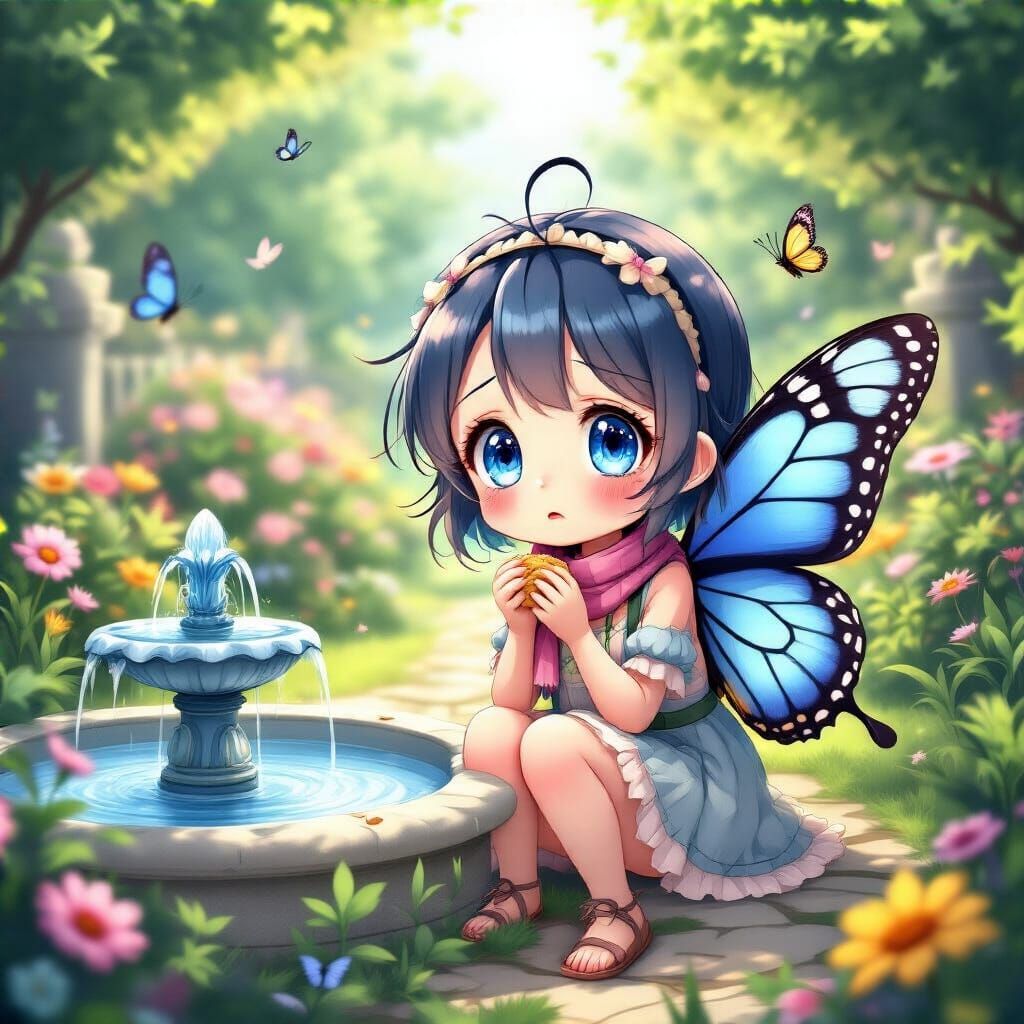 This image shows an anime-style butterfly character wearing a headband and scarf, looking lost in a whimsical garden. The butterfly is sitting by a fountain, pondering its location.