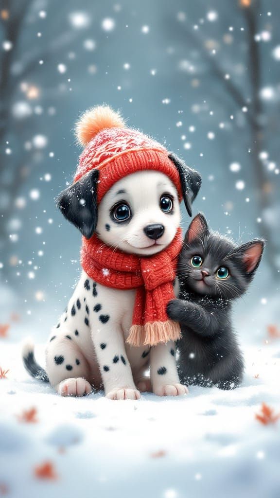 This image shows a charming dalmatian puppy and black kitten in knitted winter wear playing joyfully in a snowy landscape. Rendered in a whimsical illustration style with soft lighting and vibrant colors.