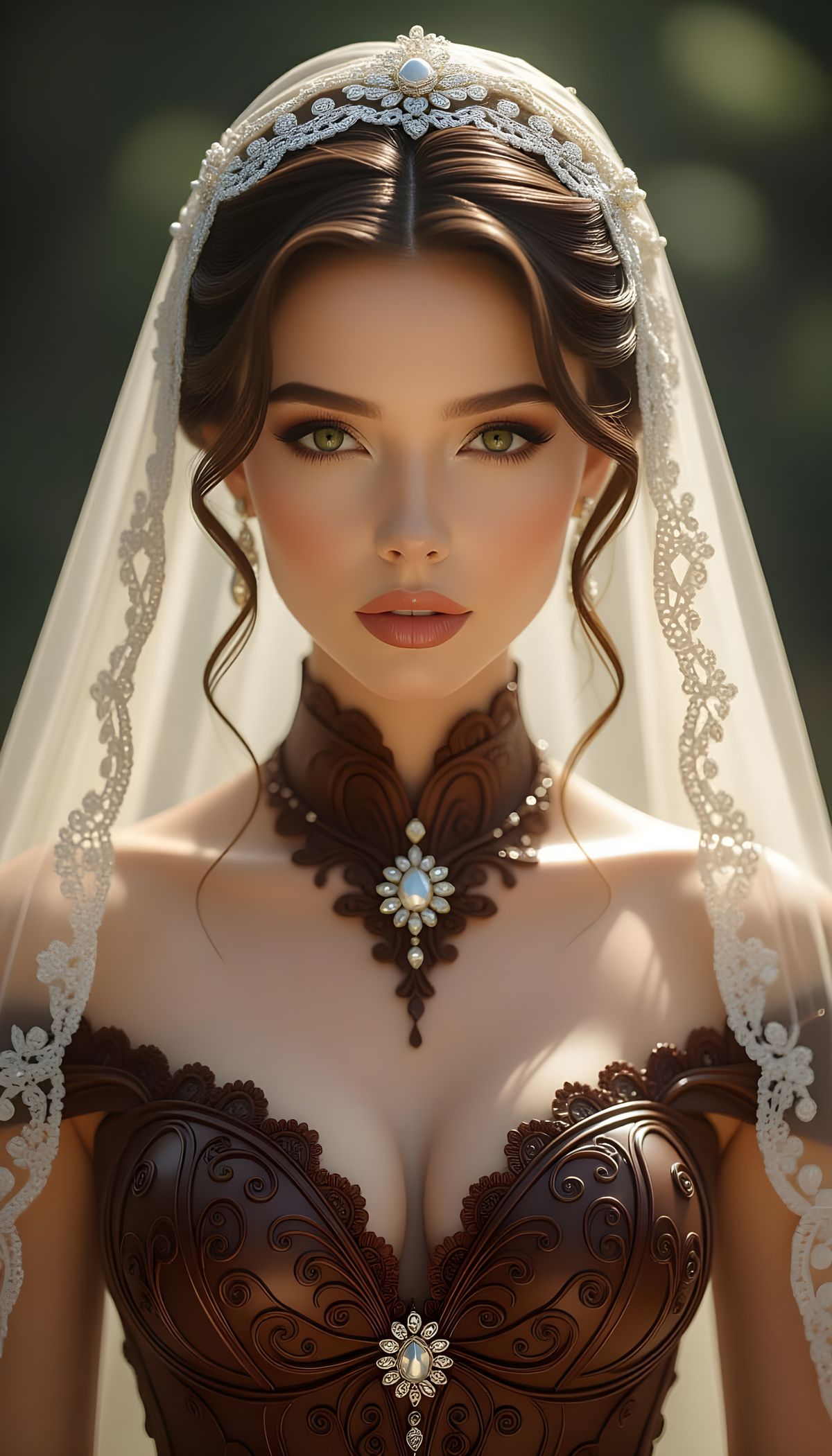 A striking picture of a hyper-realistic chocolate nymph with extraterrestrial beauty. The nymph is wearing an intricately detailed chocolate wedding dress and veil of sparkling caramel lace in a digital art style.