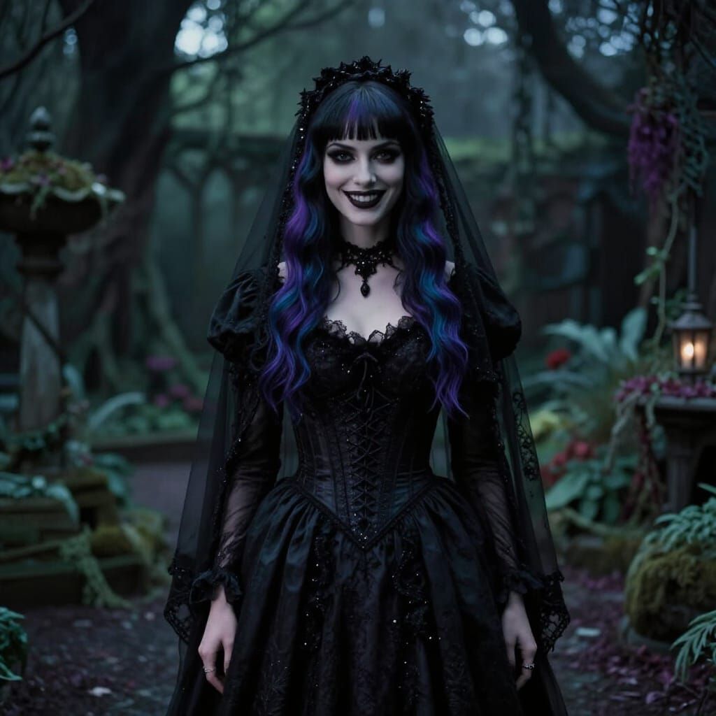 This image shows a woman in a dramatic Gothic wedding gown with a veil, posing in a creepy garden. Captured as a cinematic film still with atmospheric lighting.