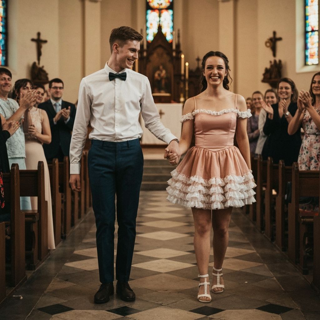 Cinematic film still of a young man crossdressing in a formal dress and heels, holding hands with a woman in a church. Relatives cheer in the background, captured with dramatic lighting and film grain.