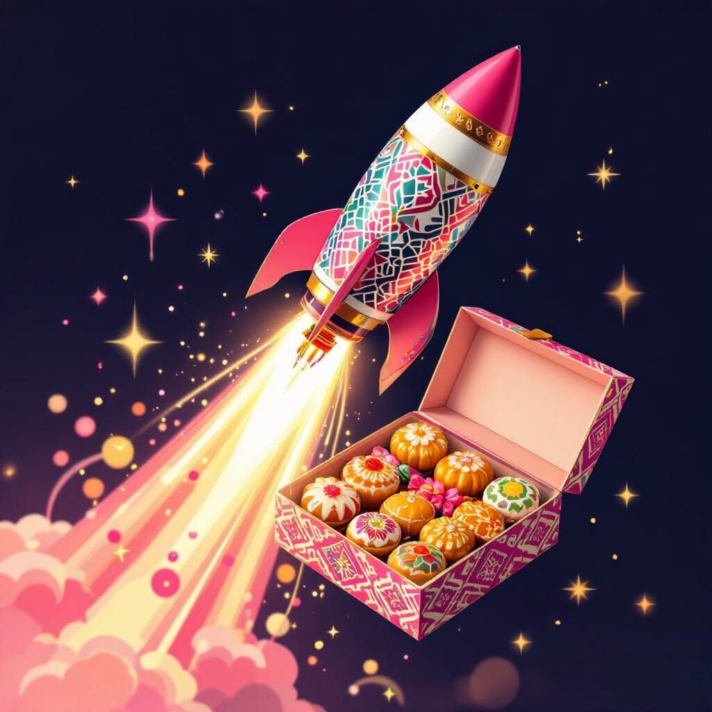 A vibrant image shows a rocket-shaped Halawet El Mouled gift box ascending. The box is decorated with Islamic geometric patterns in pink, gold and white and filled with traditional sweets in a festive scene with Arabic motifs.